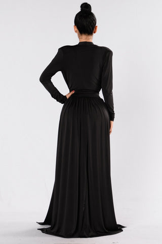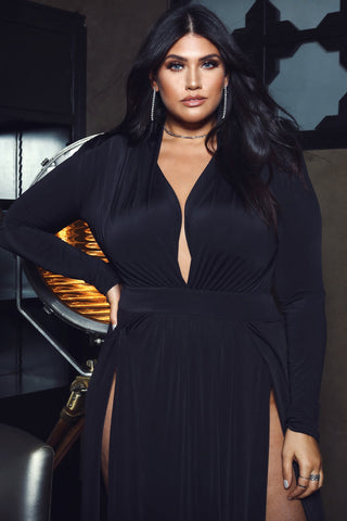 Go on the spree without the splurge! Our maxi-length Spree Dress in black features a deep V neckline, slightly padded shoulders, long sleeves and a high double slit to best accentuate your super sexy shape.