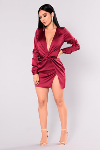 Knot your average mini dress. Show off what you're working with in our Sugar Free Dress. This best-selling (and Kylie Jenner-Approved) satin mini features a deep V neckline, front slit and knot detail. Choose from a variety of colors, but be prepared to own them all.